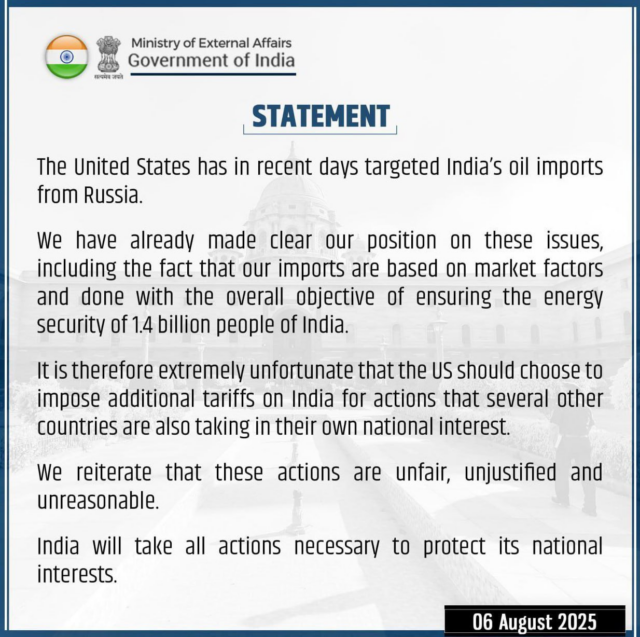 Мы уже четко обозначили нашу позицию по этим вопросам, включая тот факт, что наш импорт основан на рыночных факторах и осуществляется с общей целью обеспечения энергетической безопасности 1,4 миллиарда жителей Индии. Поэтому крайне прискорбно, что США решили ввести дополнительные тарифы в отношении Индии за действия, которые несколько других стран также предпринимают в своих собственных национальных интересах.Мы вновь заявляем, что эти действия являются несправедливыми, неоправданными и неразумными.Индия предпримет все необходимые действия для защиты своих национальных интересов».