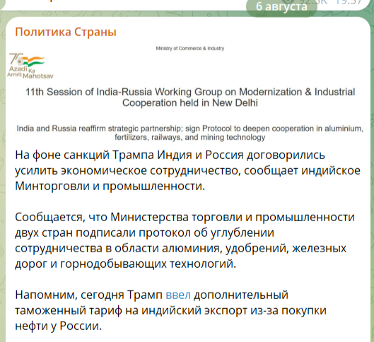 «На фоне напряженности с США советник премьера Индии по нацбезопасности прибыл в РФ. Аджит Довал проводит переговоры с секретарем Совбеза РФ Шойгу. Последний заявил, что РФ заинтересована в укреплении стратегического партнерства с Индией. Напомним, что власти Индии резко отреагировали на новые тарифы Трампа, введенные за покупку российской нефти».
