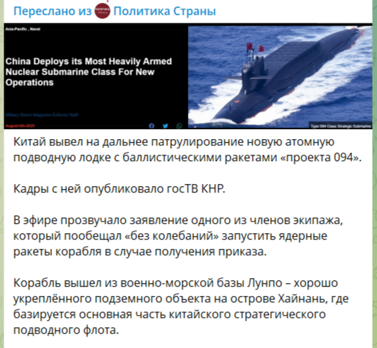 Новые подтверждения крайней серьезности отношения Китая к своему суверенитету не заставили себя ждать. Стоило только Трампу отправить свои атомные субмарины «ближе к России», как тут же последовала симметричная китайская реакция.