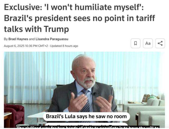 «Мы уже когда-то простили вмешательство США в переворот 1964 года. Но это уже не мелкое вмешательство. Это — президент США считает, что может диктовать условия суверенному государству, такому как Бразилия. Это неприемлемо», — заявил Лула».