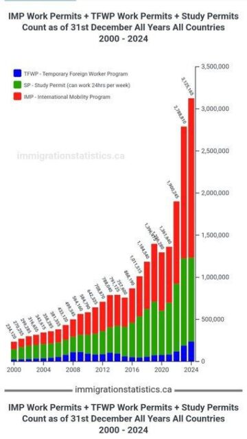Если в начале 2000‑х годов речь шла всего о 200–300 тысячах человек, то к концу 2024-го количество временных мигрантов достигло почти 3,4 миллионов. Ключевой фактор роста — не студенты и не рабочие по квотам, а именно International Mobility Program (IMP). В этой категории уже более 2,8 млн человек, и главное — здесь не нужно доказывать нехватку рабочей силы. Это и есть лазейка, которая превратилась в основной канал массового притока иностранцев.
