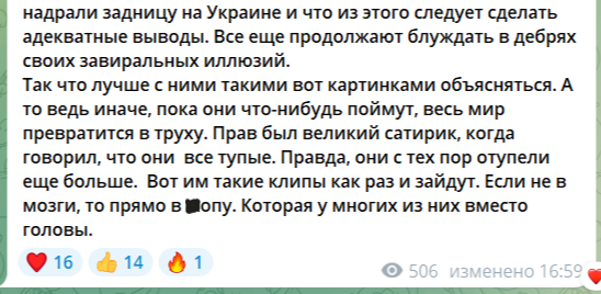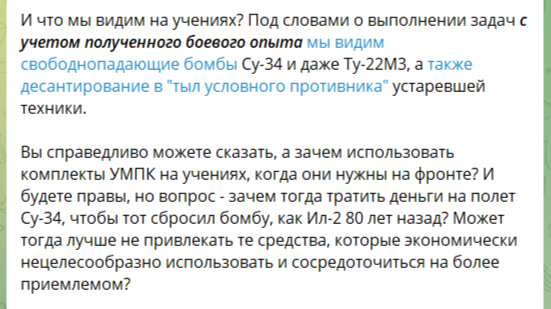 Несколько телеграм-каналов, свободно действующих в российском информационном пространстве, общим тиражом в несколько миллионов подписчиков, то есть людей явно им доверяющих, практически одновременно принялись фонтанировать якобы «обличительными» материалами в отношении указанных учений, нахально напирая на то, что они, дескать, проводятся «для галочки» и «без учета боевого опыта СВО».