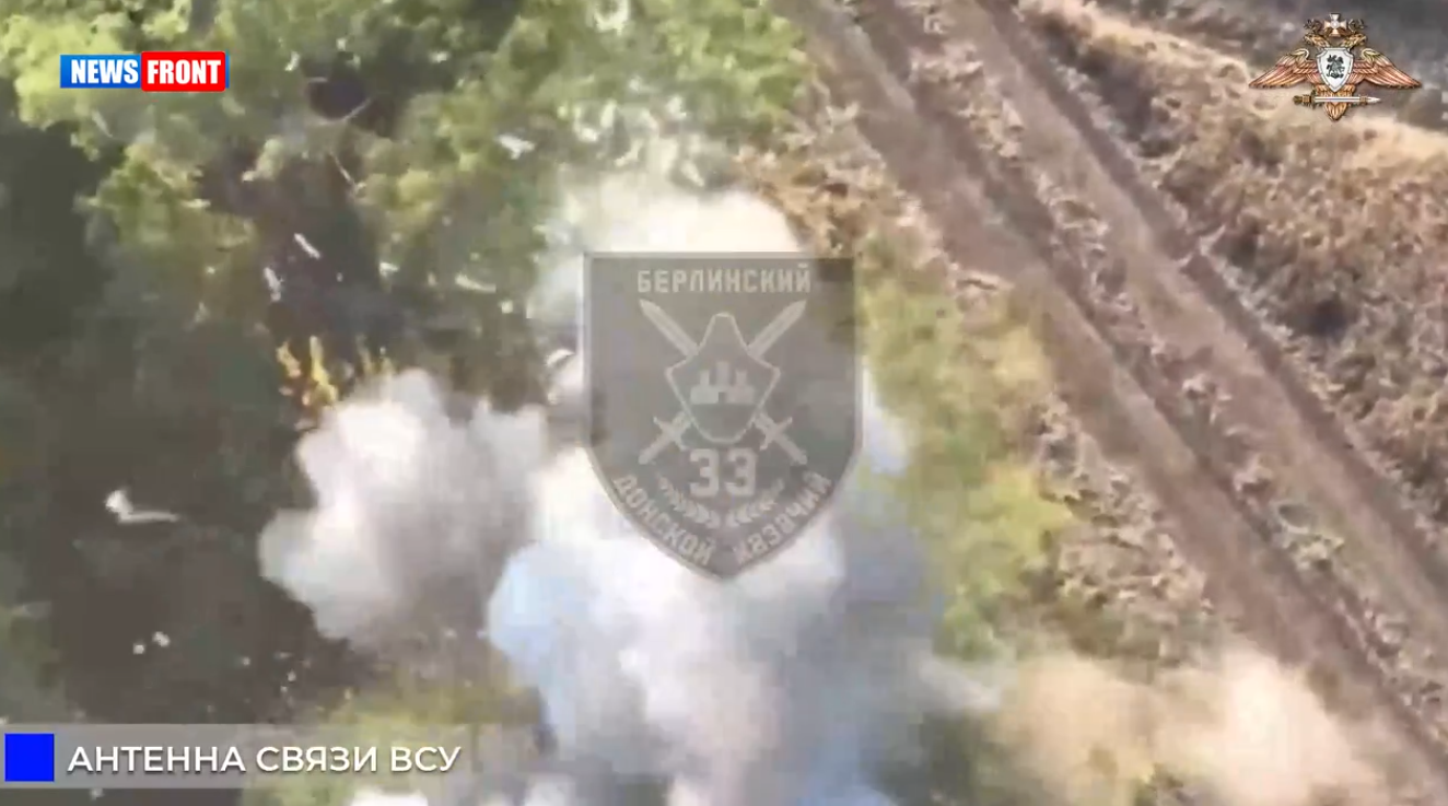 Пресс-служба Народной милиции ДНР опубликовала кадры уничтожения блиндажа, антенного комплекса связи и личного состава ВСУ.