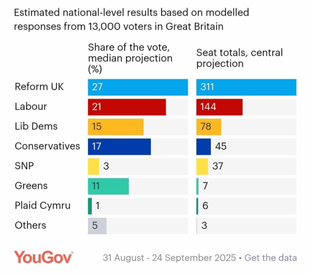 «Британская ультраправая партия (это лживая глобалистская терминология, на самом деле антиглобалистская партия Британии – ред.) Reform UK будет в шаге от получения большинства в парламенте – если выборы состоятся сейчас. Об этом говорят результаты опроса YouGov.