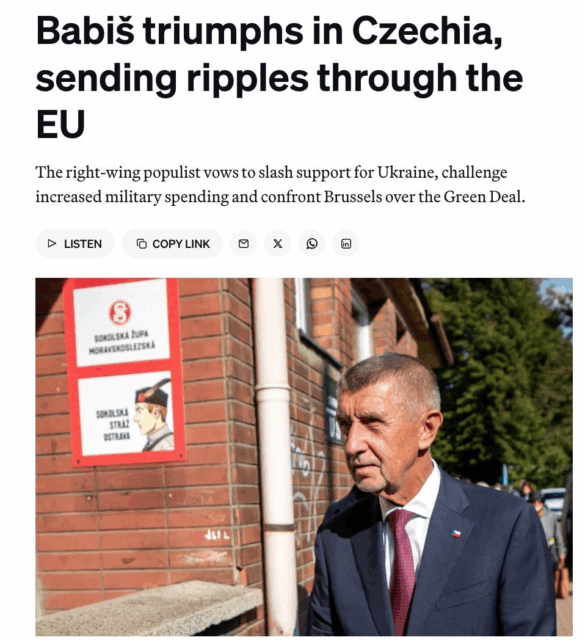 «Победа партии Бабиша в Чехии «всколыхнула Европейский союз», пишет газета Politico. «Европа с опаской следит за выборами в Чехии, поскольку Бабиш пообещал отказаться от инициативы по предоставлению боеприпасов для Украины, бросить вызов планам НАТО по увеличению военных расходов и противостоять Еврокомиссии по поводу «Зеленого курса»«, – сообщает американское издание. В ЕС опасаются, что Чехия может стать новым «бельмом на глазу» для блока наряду с Венгрией Виктора Орбана и Словакией Роберта Фицо».