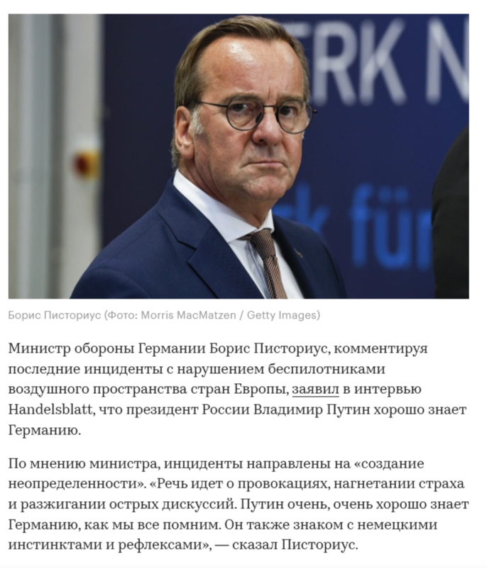 То есть и Германия и весь запад Европы свихнулись гораздо раньше – еще во времена Адольфа Гитлера. И тогда они всей гурьбой побежали покорять Россию. С результатом, который для умных людей должен был стать незабываемым. Но поскольку мы этого не видим, приходится констатировать, что данная часть мира до сих пор пребывает в таком же инстинктивно-рефлекторном состоянии, не предполагающим наличия у нее разумного, рационального начала. Иначе она бы себя так не вела. И спасибо г‑ну Писториусу, что он это прямым текстом признал.