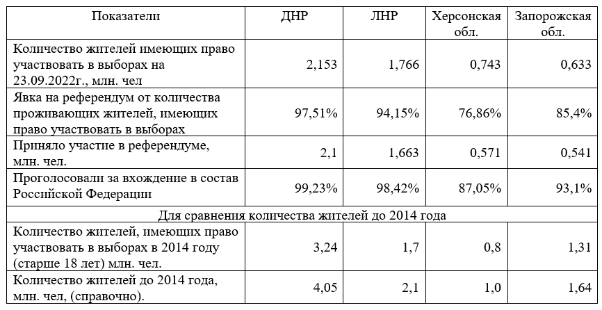 Частично Запорожская и Донецкие области были оккупированы. По этой причине не все жители этих двух областей смогли принять участие в референдуме и выразить свое волеизъявление. Но если вспомнить референдум в Донецкой области в 2014 году, когда смогли проголосовать практически жители всего Донбасса – то результаты референдумов 99,2% идентичны. Можно с уверенностью сказать, если бы в сентябре 2022 года на всей территории Донбасса был проведен референдум, результат практически не изменился. Но необходимо вспомнить, что в самом начале СВО значительная часть жителей Донецкой и Луганской областей было эвакуировано в Россию.