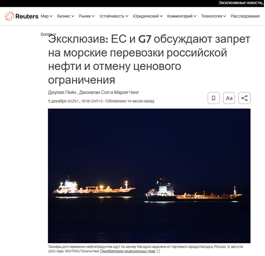 Запрет может стать частью следующего пакета санкций ЕС против России, запланированного на начало 2026 года, сообщили агентству Reuters три из шести источников. ЕС, состоящий из 27 стран, хотел бы одобрить запрет вместе с более широким соглашением G7, прежде чем предлагать его в рамках пакета, сообщили два из шести источников.»