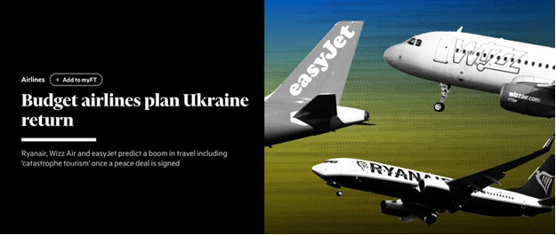 EasyJet, ранее не работавшая в Украине, также рассматривает выход на украинский рынок. Гендиректор Кентон Джарвис назвал Украину будущим “крупнейшим строительным проектом Европы” и отметил, что многие захотят вернуться домой, когда это станет безопасным.»