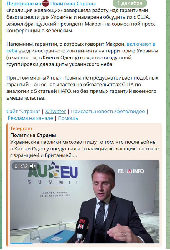 Пресс-бюро Службы внешней разведки Российской Федерации сообщает, что, по поступающим в СВР данным, Франция продолжает искать варианты прямого участия в украинском конфликте. На это, в частности, направлен правительственный декрет № 2025–1030 от 31 октября 2025 года, который разрешает задействовать ЧВК для оказания помощи «третьей стране, находящейся в ситуации вооруженного столкновения.»