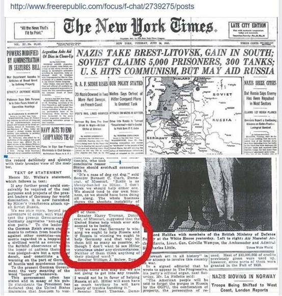 «Если мы увидим, что войну выигрывает Германия, нам следует помогать России, если будет выигрывать Россия, нам следует помогать Германии, и пусть они как можно больше убивают друг друга, хотя мне не хочется ни при каких условиях видеть Гитлера в победителях.»