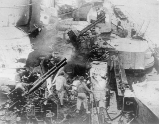 Повреждения итальянского линкора «Джулио Чезаре», полученные во время боя с Королевским флотом у берегов Калабрии.